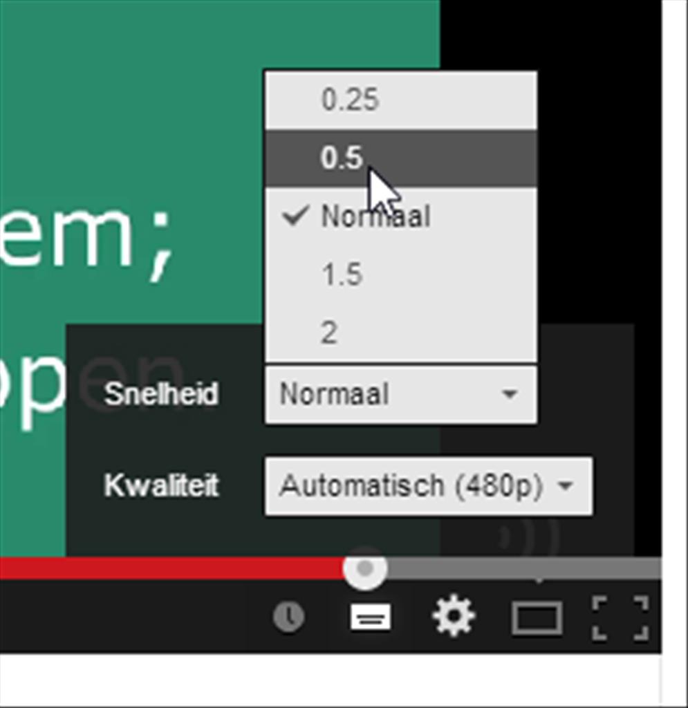 Wanneer u op 'Instellingen" klikt, kunt u de kwaliteit van de video instellen (hoe hoger het getal, hoe beter de kwaliteit. Maar: niet iedereen levert videofilms in hoge kwaliteit aan.). U kunt hier ook de snelheid van afspelen instellen: op halve snelheid (0.5), of op een kwart van de snelheid (0.25). |