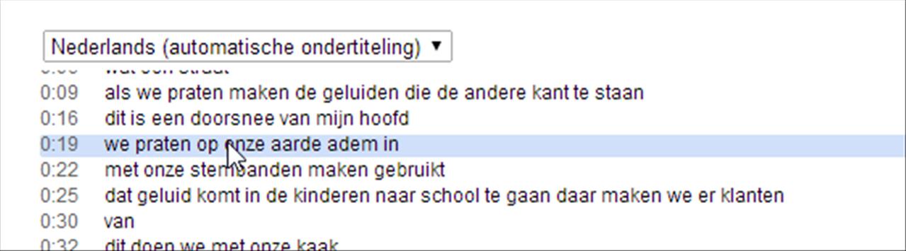Het 'Transcript' is de ondertiteling, regel voor regel onder elkaar. Klik op een regel, en de video begint daar (weer) te spelen. U kunt een zin dus net zo vaak bekijken als u wilt, zonder voor- en achteruit te spoelen. Iedere keer dat u op dezelfde regel klikt, gaat de video daar weer spelen. LET OP! Wanneer het transcript is aangemaakt door automatische herkenning van de spraak, dan kunnen er veel (leuke! en minder leuke) fouten in staan! |
